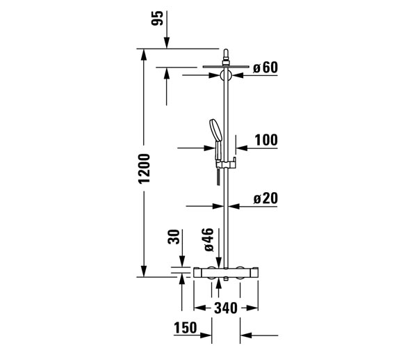 控温器盒, 安全温度定在38°C, 连接件尺寸 DN15, 软管连接件 DN15, 流率 12,6 升/分钟 (3 bar), 花洒喷头角度可调调节, 高度可调节的手持花洒柄, 连接软管内有止回阀, 伸出长度350mm, 包括:包括淋浴软管1600mm,,手持花洒air Ø 120 mm,淋喷头 Ø 240 mm, 推荐在压力 3-5 bar下进行操作, 1200 mm
