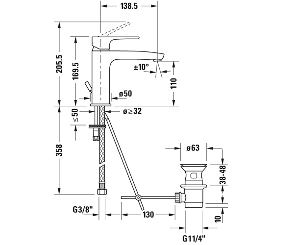 型号 B11020001 陶瓷混合系统, 伸出长度 139 mm, 连接软管 3/8", 起泡器可调节, 标准喷雾, 表面镀铬, 温度范围可调节, 推荐在压力 3-5 bar下进行操作, 带下水器套装, 170 mm 尺寸:170 mm 可变形式 流率 5,3 升/分钟 (3 bar), 连接件尺寸 DN15, 噪音级别 I B11020001010