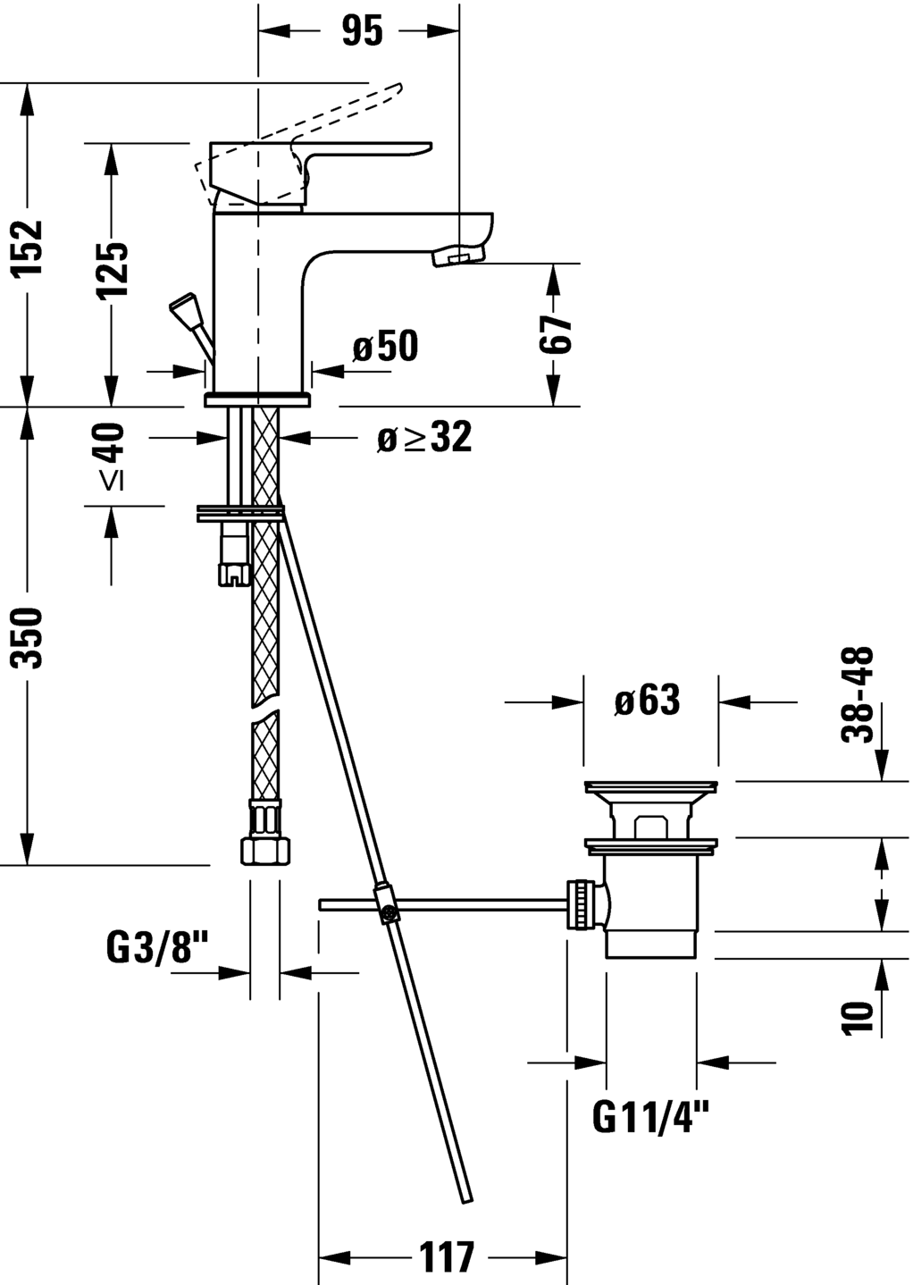 单把手面盆龙头 陶瓷混合系统, 伸出长度 95 mm, 连接软管 3/8", 标准喷雾, 表面镀铬, 温度范围可调节, 推荐在压力 3-5 bar下进行操作, 带下水器套装, 125 mm,可变形式 流量率 5,6 升/分钟(3个) A11010001010