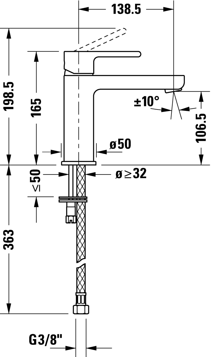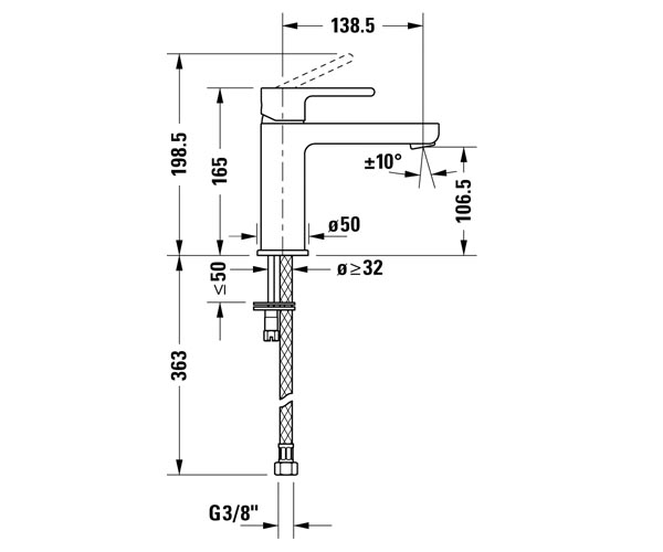 陶瓷混合系统, 伸出长度 139 mm, 连接软管 3/8", 起泡器可调节, 标准喷雾, 表面镀铬, 温度范围可调节, 推荐在压力 3-5 bar下进行操作, 不带下水器套装, 165 mm