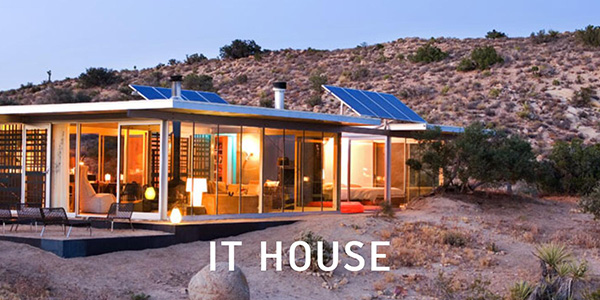 Taalman 和 Koch 其实住在洛杉矶,在洛杉矶开设自己的设计工作室。夫妻俩秉持小巧的房间和简约的居住单元的理念,为他们在美国设计界赢得了名声。几年前,这对设计师夫妇产生了在约书亚树国家公园建造一个世外桃源的想法。他们把新家命名为“IT 之家”。这里的 IT 可不是信息技术的缩写,而是取自著名的“IT 女性”(即时尚女性)这一表达。他们想用玻璃墙把新房子打造成为预制装配式房屋的典范,取这个名字是很贴切的。夫妻俩在为奥兰治县的一个客户完成了一个类似的项目之后,也想为自己建造有栋那样的玻璃房。两人终于在拓荒城附近 5 公顷的土地上实现了自己的梦想,这里以前是西部片的取景地。
