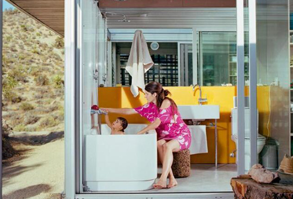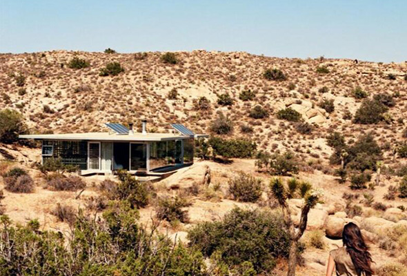 加利福尼亚州的约书亚树国家公园人迹罕至,夏季,这里的温度可以达到几百华氏度,建筑师 Linda Taalman 和 Alan Koch(洛杉矶 taalmankoch 设计工作室)在这里建造了一栋智能、节能的房子。极简的 IT 之家主要由玻璃构成,采用简约的设计将质朴的工业美学与可持续发展完美融合在一起:平屋顶上的太阳能电池收集太阳能,门和窗户与地板齐平,分布均匀,面积巨大,带来极佳的对流通风,设计巧妙的屋顶在无情的沙漠高温中提供了必要的阴凉。浴室的设计亦独具匠心,浴室配备 Duravit 浴缸和盥洗台,面向凉爽的庭院敞开,带来双重凉爽。